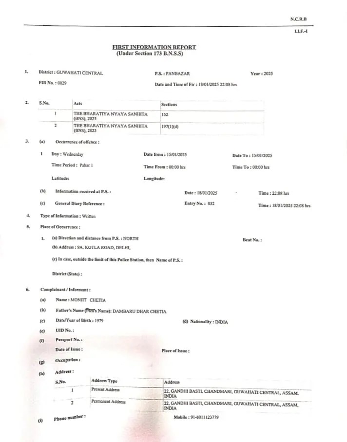 असम पुलिस इंस्पेक्टर शंकर ज्योति नाथ के हस्ताक्षर वाली एफ़आईआर में राहुल गांधी पर बीएनएसएस की धारा 152 और 197 (डी) के तहत मामला दर्ज किया गया है.